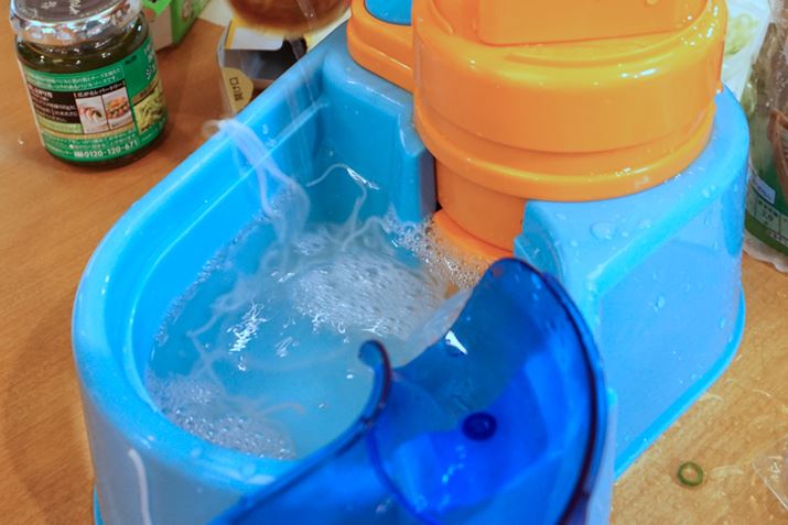 「エクストラジャンボ」で遊ぶうえで、注意点は3つ。1つ目は、前述したようにプール内に麺が溜まると吸水口が詰まってしまうので、こまめにチェックする必要があります。あるいは、サイズが合いそうな茶こしを事前に吸水口に設置しておくといいと思います。