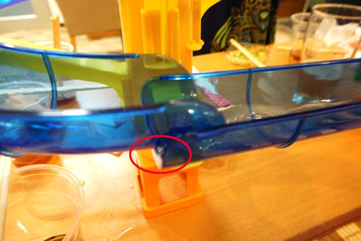 3つ目は、水路と水路のつなぎ目付近で麺をすくうこと。モタモタしていると箸で止められた麺が壁になり、流れてきた水が逆流。水路と水路の隙間から出てしまいます。遊ぶときは注意しましょう。