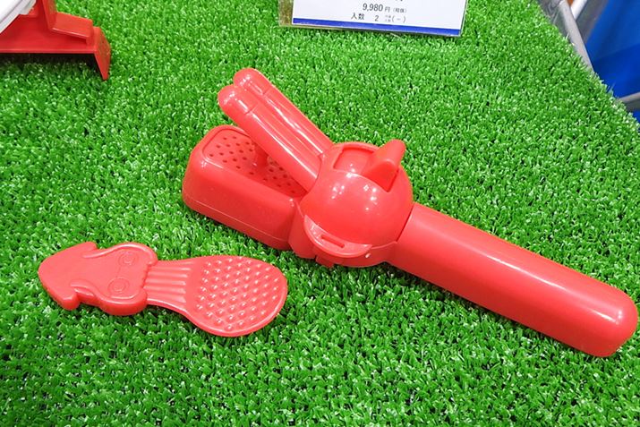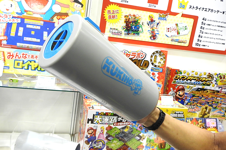 ドラえもんのひみつ道具のひとつである「空気砲」が1,980円という低価格で登場。上部のレバーを上げてトリガーを引くと、「ドカン」と発射します。発売済みで片手サイズの「くうき砲jr.」より迫力があり、発射した時の爽快感がいい感じ。“的”も付属するのでいろいろ遊べそうです。