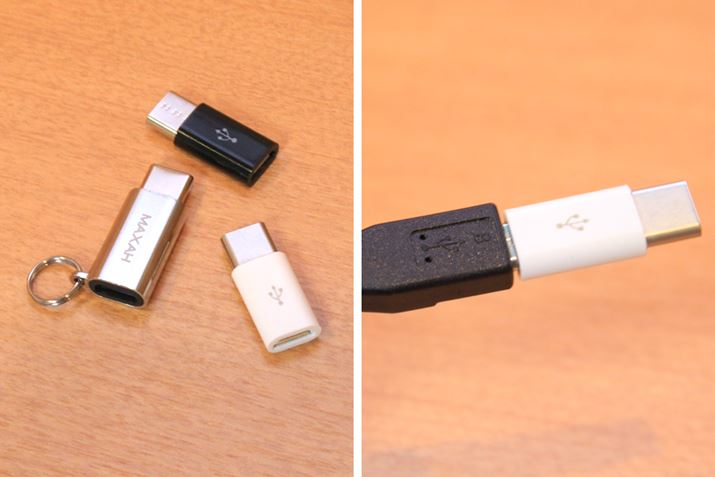 microUSB端子に直接取り付けるタイプのUSB-Type Cアダプター。これで手持ちのmicroUSBケーブルから変換してUSB-Type Cスマホを充電しているヒトも多いですよね