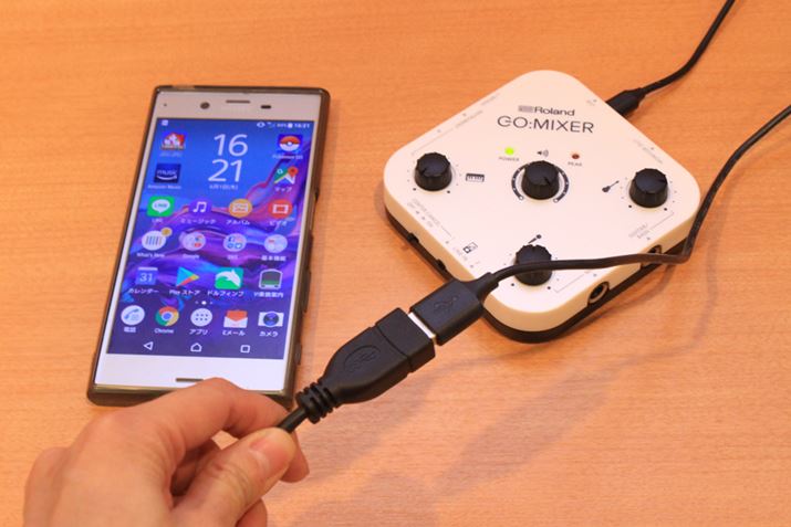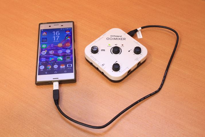 アダプタは、USB-OTG(※)対応のものと非対応のものを両方用意して試してみましたが、筆者の環境ではすべてGO:MIXERを駆動させることができました。なお筆者のXperia XZもそうだったのですが、スマホの機種によってはUSB接続機器の設定をいじらないといけない場合もあるので注意です。(※USB OTG(On-The-Go)=スマホなどUSB機器をホスト化することで、PCを介さずにUSB機器同士で通信できるようになる規格)