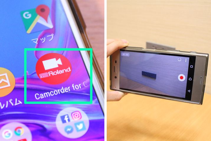 まずは、ローランドが無料提供している動画撮影アプリ「Camcorder for GO:MIXER」をスマホにインストール。スマホの標準カメラアプリでは、GO:MIXERからの入力音声は認識されず録音できないようなので、収録には必ずこの専用アプリを使用しましょう。