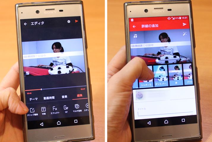 従来であれば、別々に収録した動画と音声をいったんPCに取り込んで、映像編集ソフトでつなぎ合わせなくてはならず、うまくリップシンクさせるためにコツも必要でした。その点、GO:MIXERは、映像と同時に音声もキレイに録れるので、スマホでそのまま編集してYouTubeにアップロードできます