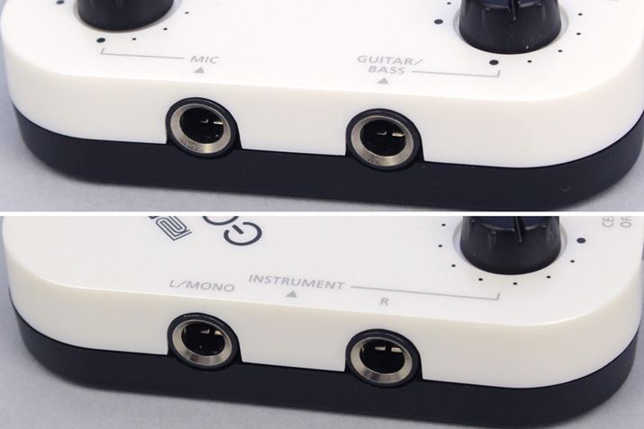 本体側面に、入出力端子を装備しています。マイク入力とギター・ベース入力(写真上)は1系統ずつで、個別に音量調整が可能。INSTRUMENT入力(写真下)は6.3mm標準タイプをL/Rで装備し、Lch 1系統だけ使うとモノラル入力になります