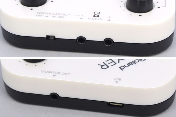 LINE INは3.5mmステレオミニを2系統備えていて(写真上)、オーディオプレーヤーなどを接続することができます。MONITOR OUT端子は3.5mmステレオミニで(写真下)、ここに手持ちのヘッドホンを接続してモニタリング可能。その隣にあるmicroUSB端子から、スマホと直接接続します