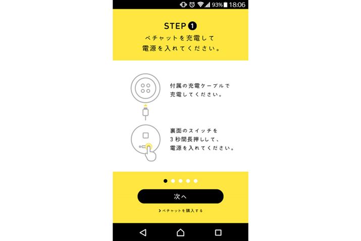 このペチャットは充電式のため、使用する前には充電が必須です(約3時間でフル充電)! 連続使用時間が1〜2時間と少々短めに感じましたが、子供の飽きやすさを考えると妥当なところなのでしょうか。充電ができたら、スイッチをオンにして初期設定スタート。