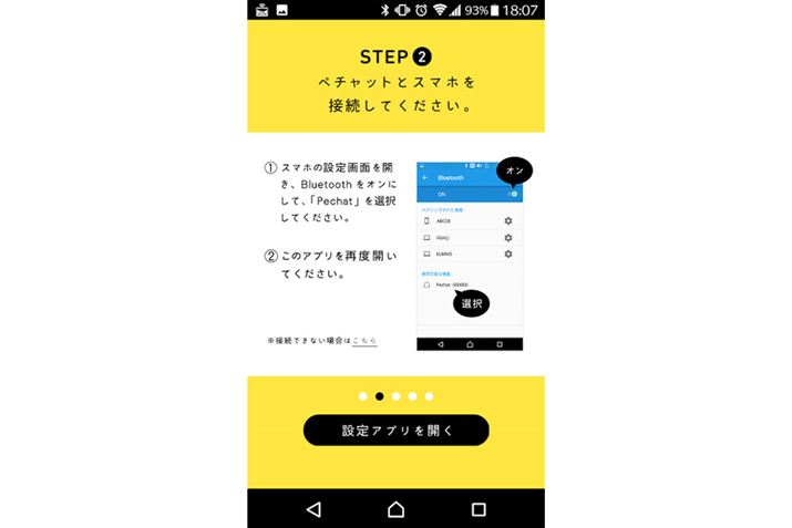 お手持ちのスマートフォンとペチャットをBluetooth接続します。iOS9.0以上とAndroid5.0以上の端末に対応。