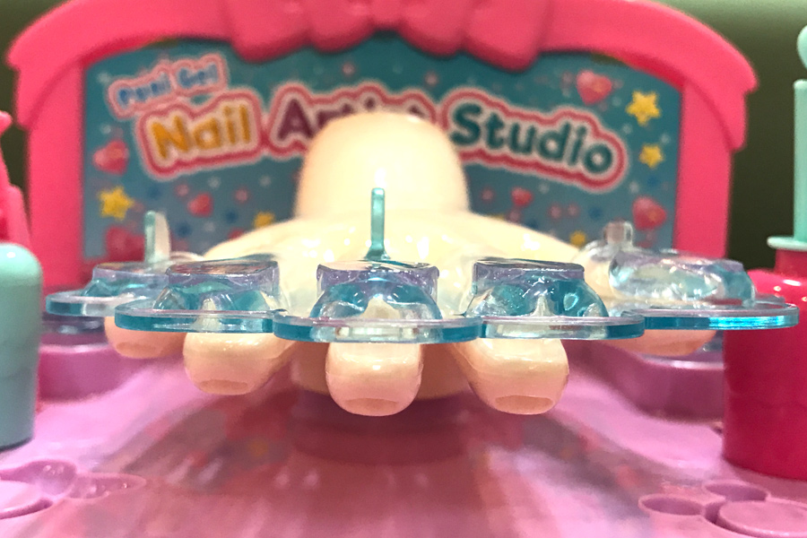 ネイルアーティストスタジオ本体。台座部のハート型や星型にシリコンジェルを流して、そのジェルを左右のネイルボトル型のスティックで少しずつすくってネイルチップに塗っていきます。ネイルだけでなく、お揃いのリングやチャームも作れるのが乙女心をくすぐります