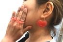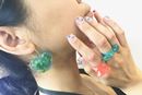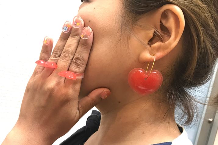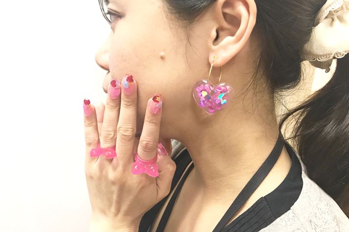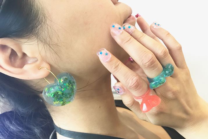 ハート型や星型のチャームには穴が開いているので、チェーンなどを通せばキーホルダーなどとして使用できます。ひと工夫して、ループ型の細いピアスを通してみたところ、夏にぴったりの透明感のある大ぶりのピアスができました。お母さんはピアス、子どもはお揃いのリングとネイルなどでお揃いコーデを楽しむのもいいかもしれません。
