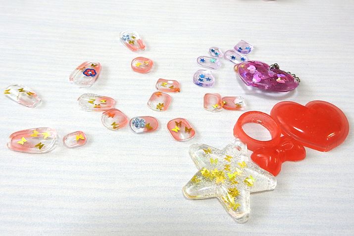 ・ハート型などで作るアクセサリーにデコチップを入れる場合は、デコチップを先に入れたほうがキレイ