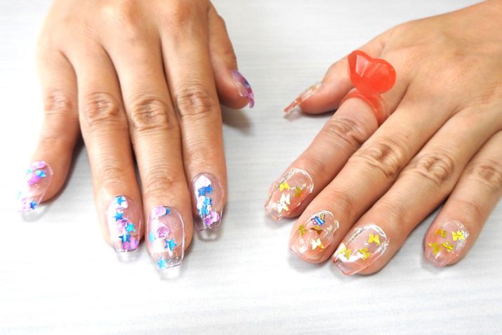 ジェル選び中。手前にある小袋は付属のデコレーション用シールとハート(ピンク)、星(青)、蝶(ゴールド)の3種のデコチップ