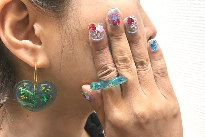 筆者が事前に作ったものですが、かわいいお揃いアクセサリーができました。ロングのネイルカバーを使うとより大人っぽくできます