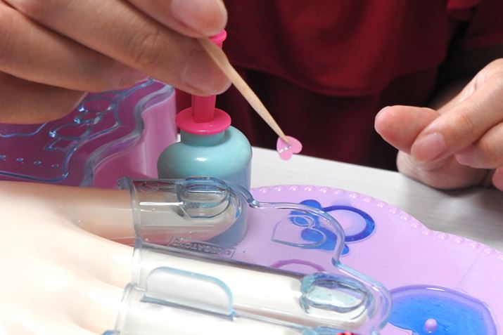 好みのジェルを型に入れたら準備完了。専用ネイルカバー(ショートorロング)をハンドマネキンの上に置いて、ネイルボトルの形をした左右のスティックでジェルを少しずつすくって塗っていきます。今回は子どもの手にもつけやすいショートネイルをチョイス。ジェルは1色でもキレイですが、左右の手で色を変えたり、グラデーションにするためにクリアジェルとカラージェルを同時に使うのもオシャレですよ。