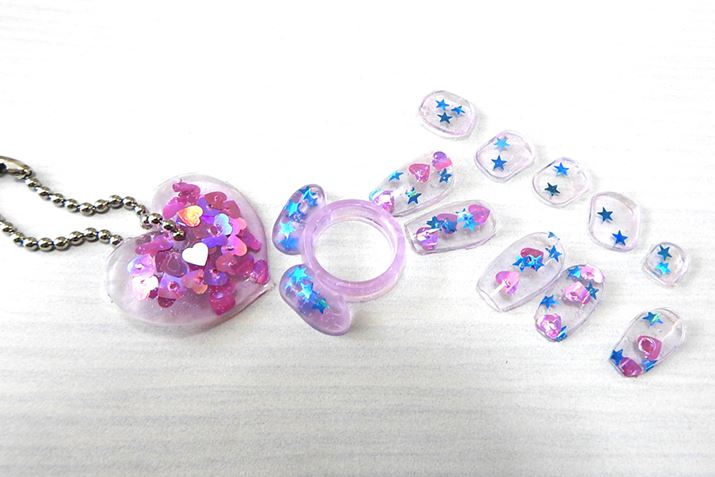 最後にハート型のチャームとリングにもデコチップをパラパラ。冒頭にも書きましたが、ジェルを入れる前にチップを入れたほうがキレイにできました