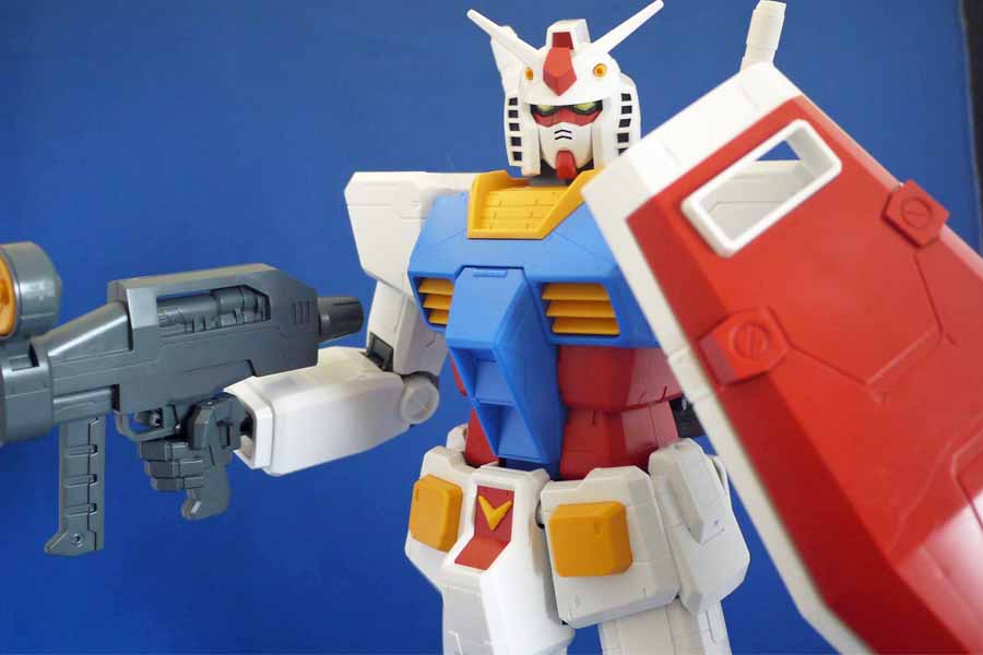 もちろんガンダムということで、巨大なシールドとビームライフル、ビームサーベルも付属し、それぞれを持たせてのポージングもできます。ライフルやシールドは専用の持ち手が付属しており、しっかり手首に握らせることができるので、ふらついたり、落ちたりすることはありません。またライフルはガンダム特有の両手持ちができるなど、劇中のイメージも再現できるようになっています。この大きさでここまでできると感動的ですね。