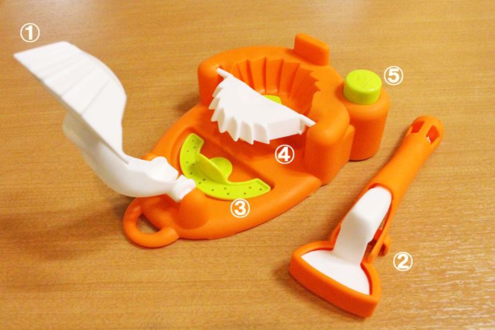 一見複雑そうなマシーンですが、よーく見ると、各パーツに番号が書かれており、番号どおりに工程をすすめていくと…あっという間に餃子の完成! というわけなのです。