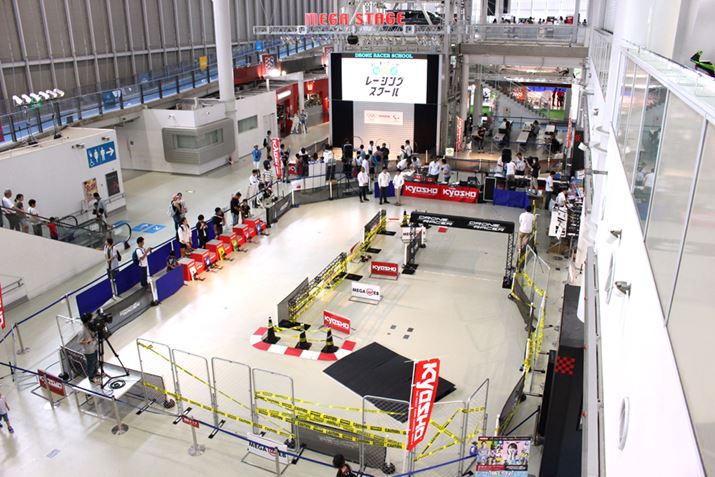 「DRONE RACER」オフィシャルイベントは、MEGA WEBのトヨタ シティショウケース1 階の一角を使って開催された。ど真ん中にはオフィシャルレース用コースが鎮座