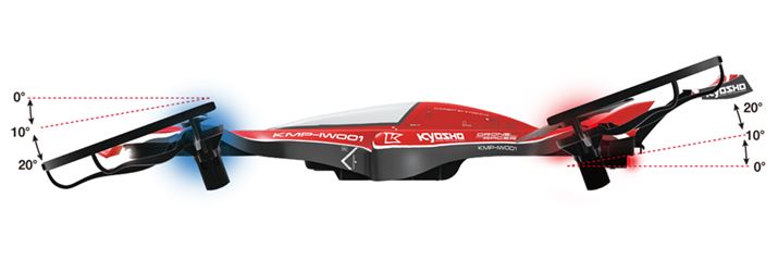 左右のプロペラをひとつのアームに接続した、上下分割式のH型シャーシを採用。プロペラユニットの角度が0°、10°、20°に変更できる。安定重視(0°/最高速度:約30km/h)か最高速重視(20°/最高速度:約34.5km/h)かで使い分けられる
