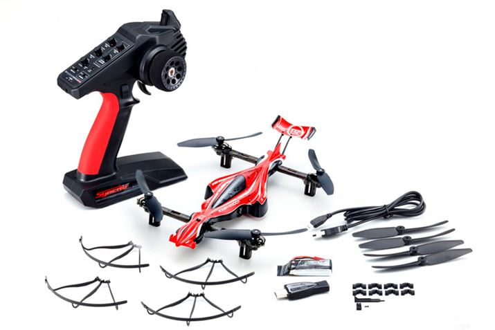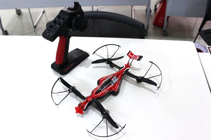 名の通りレースのために作られた「DRONE RACER」は、スマホなどで操作する既存品とは異なり、付属のホイールタイプ送信機により、本格RCカーのように操れるドローン。超音波センサーをはじめ、6軸ジャイロスコープ(3軸角速度センサーと3軸加速度センサー)、気圧センサー、ハイレスポンス小型コアレスモーター4機を搭載。ワンタッチ操作でテイクオフから自動ホバリングまでできるため、誰でも簡単にドローンレースに入門できる。