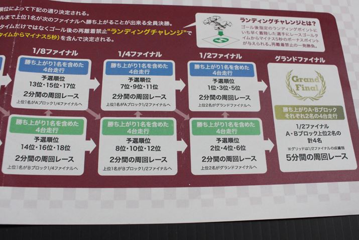 各ファイナルレースの順位は、周回タイムだけではなく、ゴール後のランディングチャレンジで得たボーナスポイント(ゴールタイムからマイナス5秒)を加えて決定される。再着陸禁止の一発勝負だ
