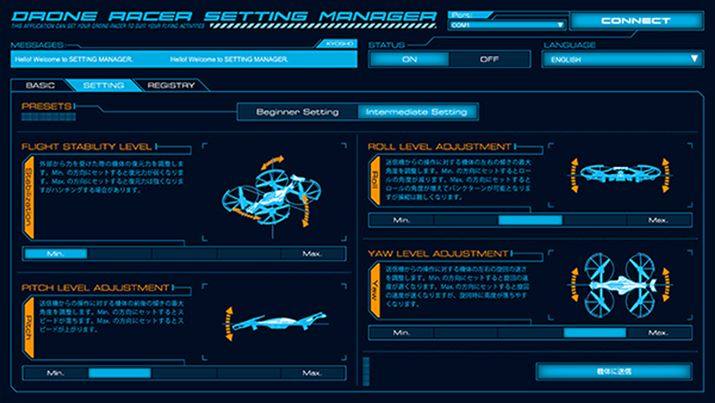 「DRONE RACER」は、PCやAndroidのアプリ内と繋いで、操縦性や直線スピードなどの機体特性をセッティングできる