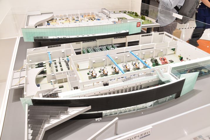 「バンダイホビーセンター」の精巧な模型も展示。成形セクションにあるガンダムやザクカラーの射出成形機も、細かく再現されている