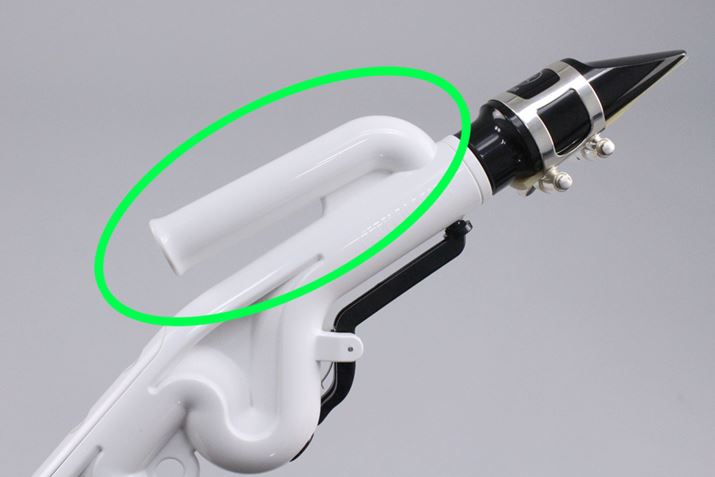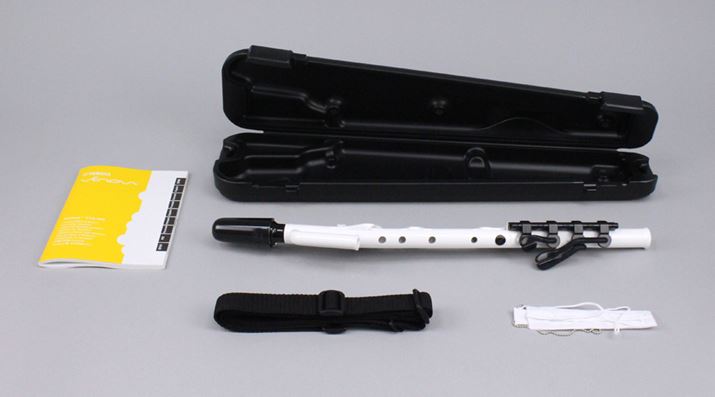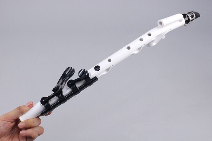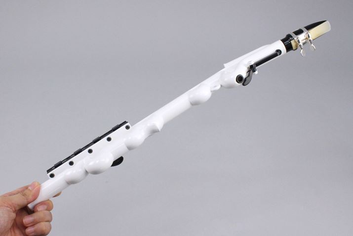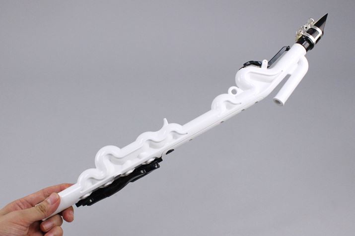 さっそくVenovaの特徴を見ていきましょう。ABS樹脂製の白いストレートな本体には、リコーダーのような音孔があいています。しかし、吹き口にはマウスピースとリードが付いているという、何ともフシギな楽器です。