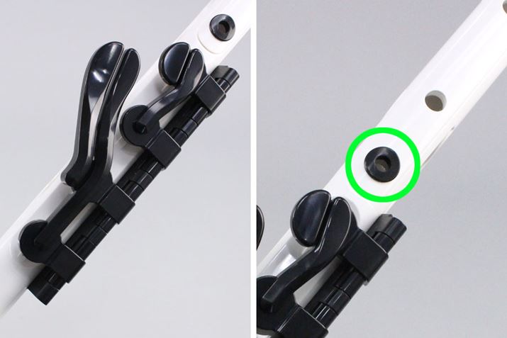 低音部には、より無理なく押さえられるようにキイを配置(写真左)。また、ファを鳴らす音孔にアダプターのはめ込みができるようになっています(写真右。緑マルの部分)。このアダプターを装着すると「ジャーマン式」、取ると「バロック式」の押さえ方でファの音を鳴らせます。このあたりはめちゃめちゃリコーダー感覚!(写真はジャーマン式の状態)