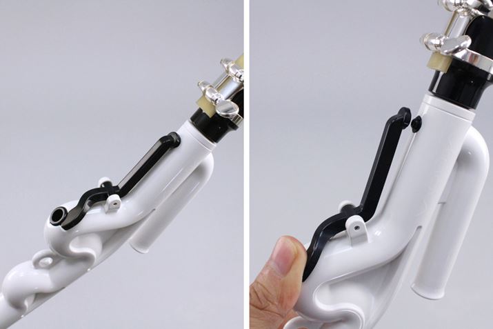 一般にリード楽器は、サックスのような形の円錐形管楽器と、クラリネットのような形の円筒形管楽器に分類され、それぞれ異なる音色で鳴ります。Venovaは、見た目はストレートな円筒形ですよね。しかし、本体の一部を分岐させた「分岐管」が付いていることで、円筒形でありながら円錐形管楽器に似た音色を再現するのです。