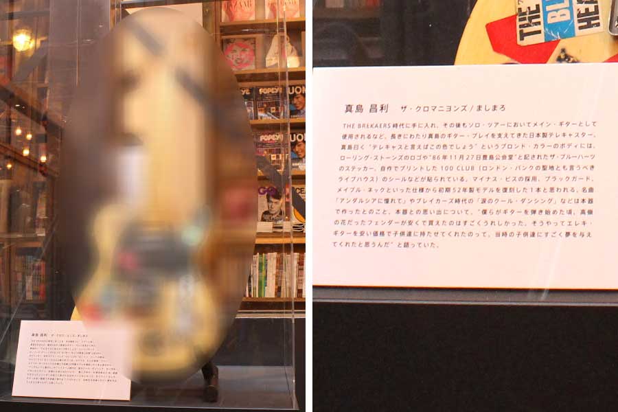 マーシーがTHE BREAKERS時代からブルーハーツ時代にかけて使用していたテレキャスの実物も! 残念ながら写真はメディア掲載NGだそうなので、ギリギリ大丈夫そうなモザイク処理でお届け。昔のブルーハーツステッカーとか貼ってあって好きな人にはたまらないのでは? 実物を見たい人はカフェにGO!