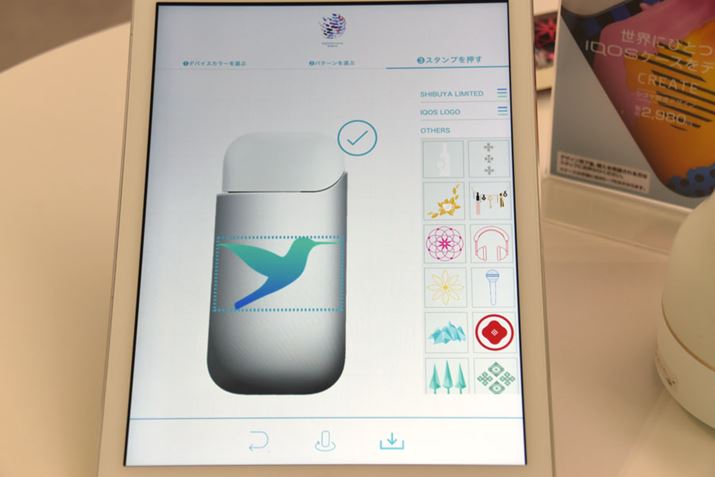 デザインパターンが決まったら、スタンプを選んで、サイズを決め、好きな場所に配置できる。写真のようなアイコスのロゴも用意されている