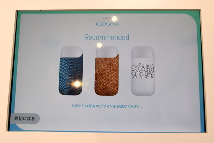 新コンテンツのひとつ「CREATE」は、タブレット端末上でデザインしたアイコスケースを購入できるというサービス。数十種類のデザインパターンやスタンプを使って、タブレット上で自由にデザインできる。価格は1ケース2,980円(税込)。