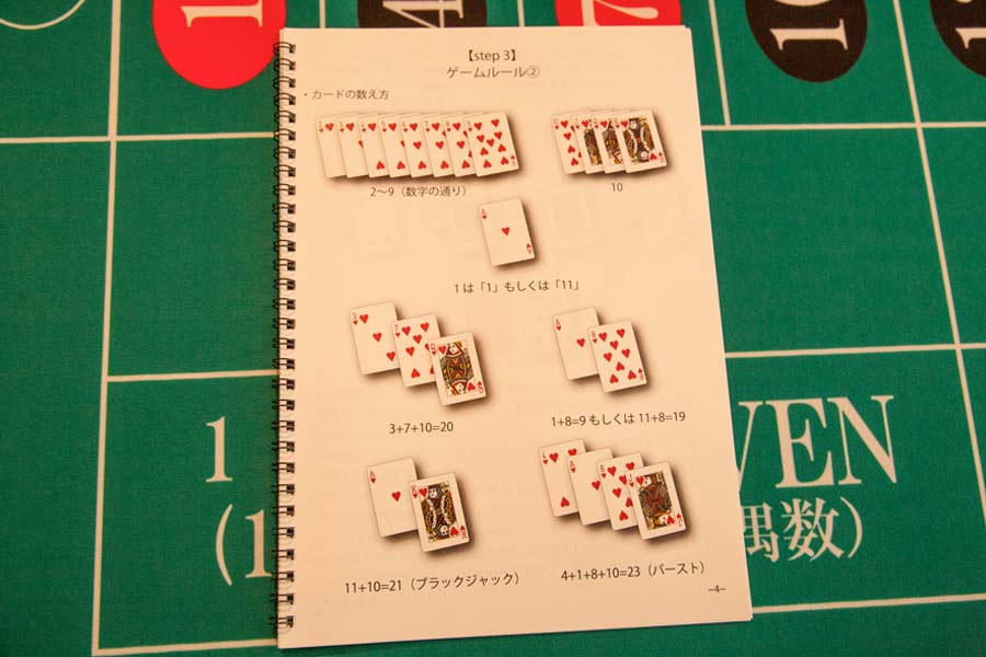 きちんと教科書も用意されている。「ダブルダウン」「スプリット」などの聞きなれない言葉も飛び交っているが、講師の方が解説を入れつつ進めていく。実際にゲームをやりながら教えていくやり方は、端で見ていてもわかりやすかった。授業って感じがしなくて楽しそうだ。