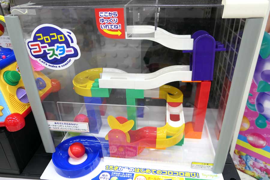 堀内さんコメント:「店頭にサンプルを置いていますが、週末になると多くのお子さんがコロコロコースターDXのサンプルで遊んでいます。ボールが2色になっているので、ボールだけを使っても喜ぶお子さんが多いですよ。小さいうちは短いコースで楽しんで、大きくなったら複雑なコースを組み立てるというように、成長にあわせて遊び方を変えられるおもちゃです」