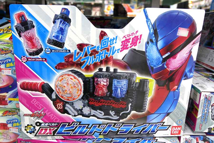毎週日曜日午前9時よりテレビ朝日系にて放送している「仮面ライダービルド」に登場する「変身ベルト DX ビルドドライバー」。ベルト本体に液体容器のようなボトルが2本同梱されています。ベルトにボトルをセットし、レバーを回すと変身音が鳴り、発光して劇中の変身シーンを再現します。