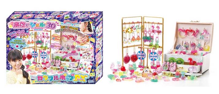 大人の間で流行しているUVレジンに似たアクセサリーをつくれるおもちゃです。ぷにぷにした感触がおもしろいです。この商品は同梱のアクセサリーパーツが豊富で、立体的なパーツが作れます。こちらも大人気で、取材時は入荷待ちでした。