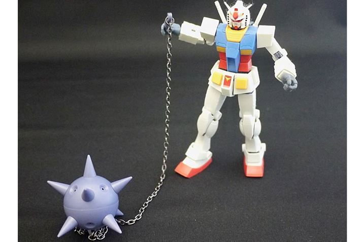全長は約12.5cmなのでアッガイよりちょっとだけ小さいのですが、横幅があり、手足も大きいので、アッガイより大きく感じます。そしてこの手足がかなり柔軟に動きます。腰の反らしとひねりもあるので、大きなアクションポーズが取れるのも魅力です。何といっても、ガンダムの武器として使える大型のガンダムハンマーが付属しており、劇中のシーン再現はもちろん、ガンダムのエフェクトパーツとしてもいろいろと遊べますよ。