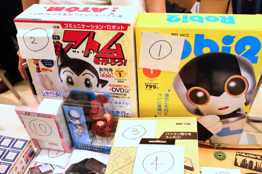 これ、無料だといち早く気づいた、情報に敏感なお客様が、ハイエナのように群がってくれました(失礼!)。ちなみに、「週刊鉄腕アトムを作ろう!」や「週刊 ロビ2」はお父さんに連れられて来た小学生の男の子が当ててましたよ! あの喜ぶ顔が忘れられません。ハイエナ、あ、失礼、情報に敏感なお客様のおかげで、開場からものの40分で、30製品すべてがなくなりました。正直、ビビリました。だって、これなくなったら、もうガムと紙切れしか配布するものがねえっ!