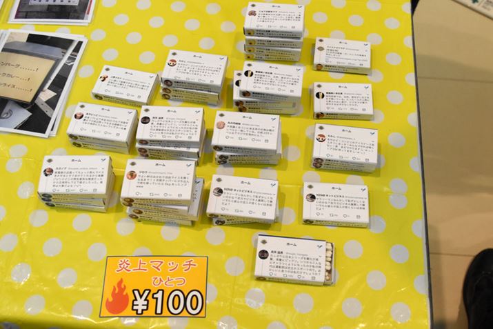 本当に炎上しちゃう「炎上マッチ」を出品していた「ハイエナズクラブ」さん。箱には、炎上しそうな創作ツイートをプリント!