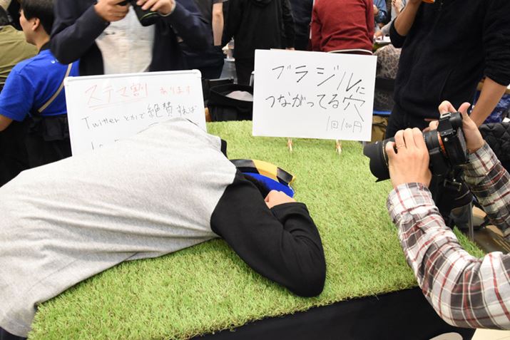 「ブラジルにつながってる穴」1回100円。頭を突っ込んでいるこの中学生らしき少年は、この状態で10分近く動きませんでした。なんだかヒヤヒヤしましたが、ブラジル人と軽快なトークでもしていたんでしょう
