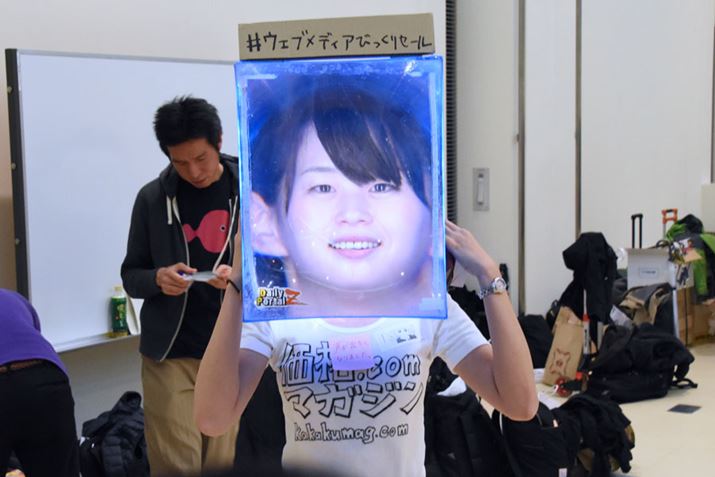 主催の「デイリーポータルZ」が用意した不思議な箱。「価格.comマガジン」の小顔の女性スタッフが、3頭身になりました