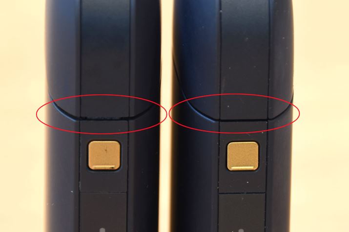 左がクズが溜まりすぎたアイコスで、右が掃除した正常なアイコス。左側はホルダーがしっかり閉まらないため、ポケットチャージャーのフタも完全に閉まっていません。このまま放置しておくと、フタの閉まりが悪くなる故障の原因になってしまうことも