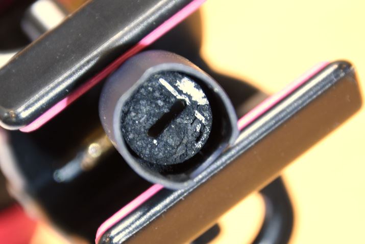 写真のように硬くこびりついたたばこクズは、「IQOSクリーナーブラシ」と「IQOSクリーニングスティック」を使っても除去できないことがあります