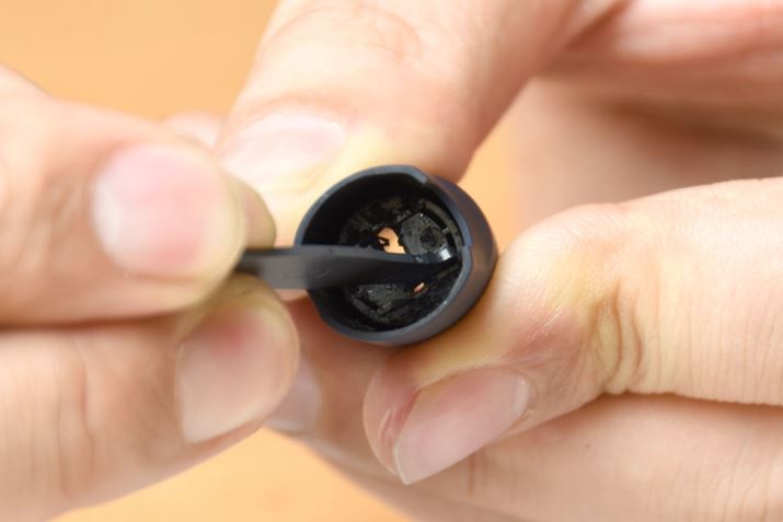 掃除を忘れがちなのがキャップの内側。ここにクズが溜まると、ホルダーがしっかりと閉まらなくなります。写真の溜まり具合はひどいほう。ここまで汚れると、ホルダーをポータブルチャージャーに収納したときに、フタが閉まらなくなります