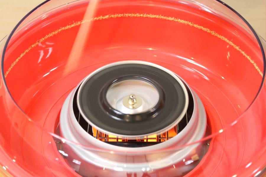 説明書によると、電源を入れたらまず10分ほどヒーターが温まるのを待たなければなりません。スイッチをONにすると、モーター音とともに中心部分が回転し始めます。そのまましばらく待っていると…。