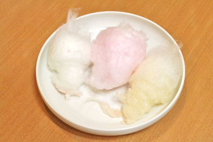 形のいびつさもさることながら、肝心の色の違いがほとんどわかりません。これはきっと、各色のわたがしがキレイな層になっていないのが原因でしょう。