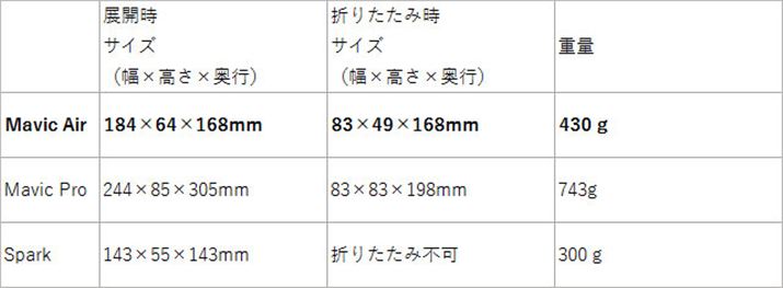 「Mavic Air」は折りたたんだときに「Mavic Pro」と比べて幅は同じであるが、奥行は3cm、高さにおいては半分近くまでスリム化している。展開時も大幅にサイズダウンしているのがわかる。重量も「Mavic Pro」の約41%の軽量化に成功しており、300gの「Spark」に迫る勢いだ