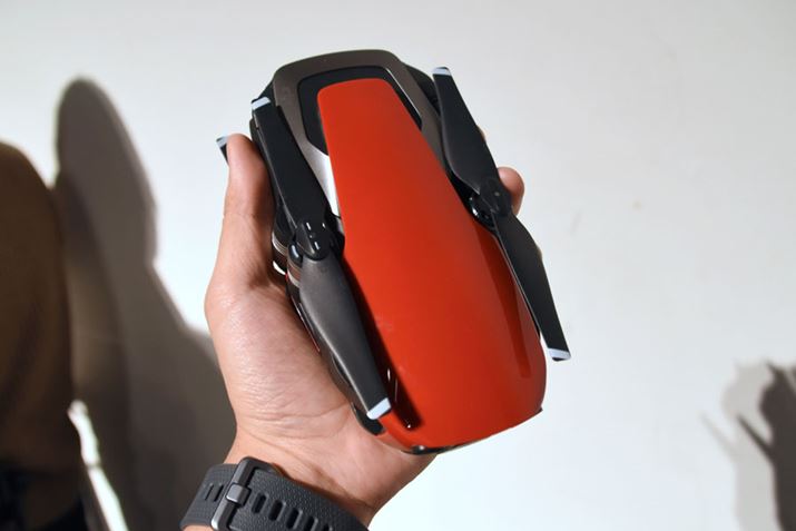 「Mavic Air」のカラバリ「フレイムレッド」を折りたたんだ様子。まさに手のひらサイズで、携帯性は高そうだ