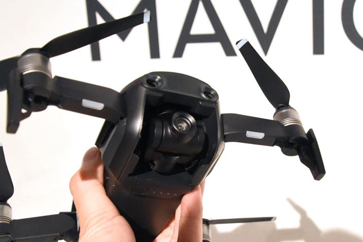 「Mavic Air」のメインカメラには、500gを切る同社の小型ドローンでは初めて「3軸ジンバル」を搭載。3方向に衝撃吸収部が配置されていることで、カメラの振れ範囲は角度0.005°まで抑えられ、滑らかで安定性のある撮影が可能になった。