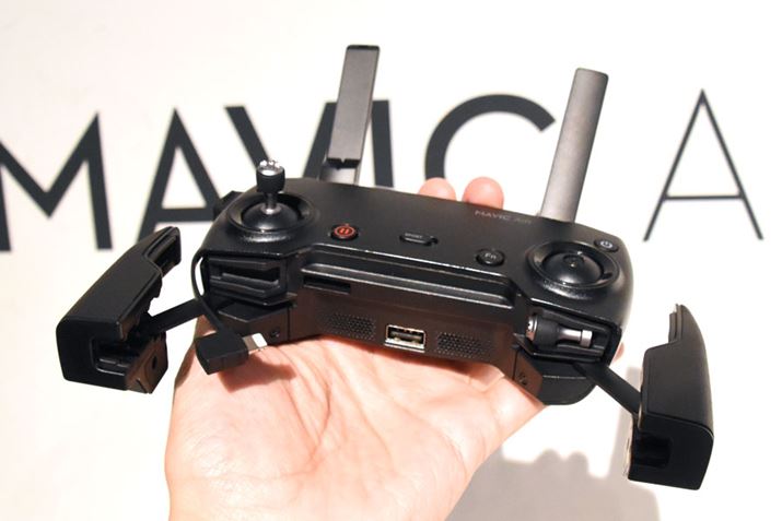 「Mavic Air」の専用送信機。スマホと繋げるUSBポートは、Lightning、Micro USB(Type-B)、USB-Cに対応